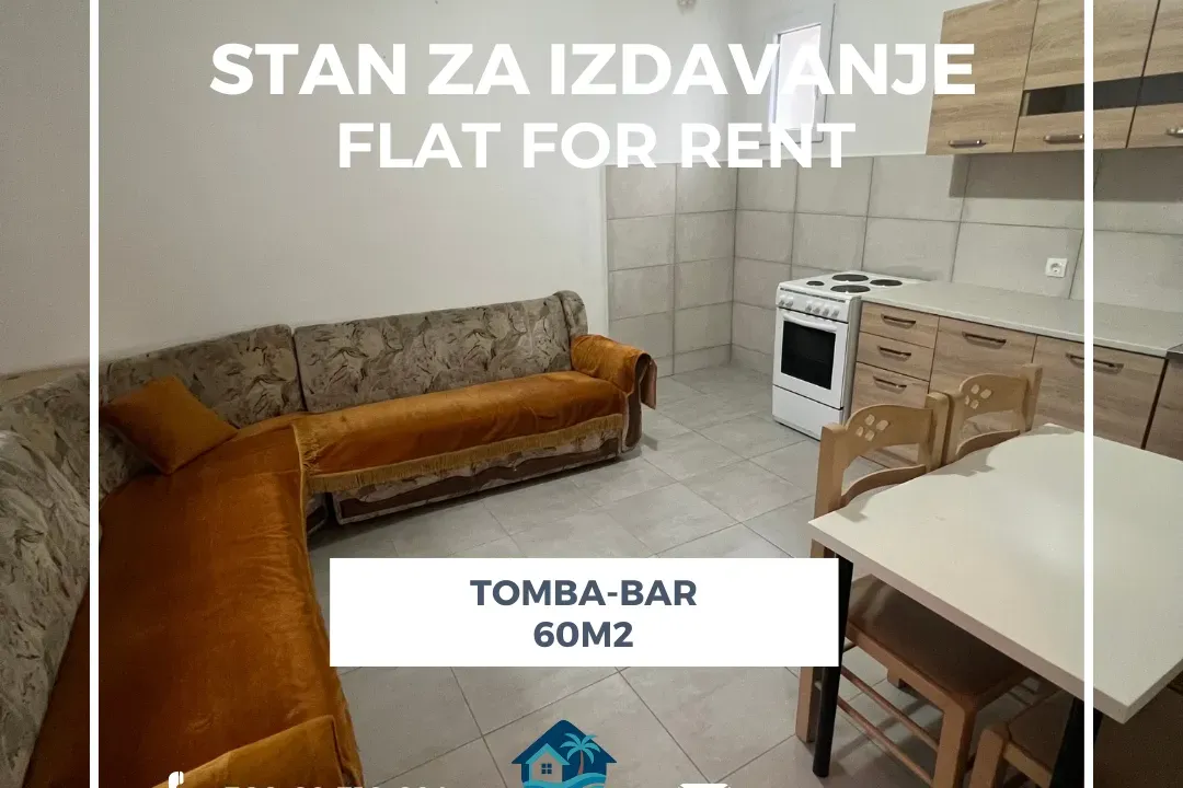 IZDAVANJE / RENT Izdaje se opremljen dvosoban stan u naselju Tomba grad Bar. Stan ima 60 m2. Stan se nalazi u kući i ima zaseban ulaz. Ima parking. Struktura stana: -Hodnik -Dnevni boravak i kuhinja -