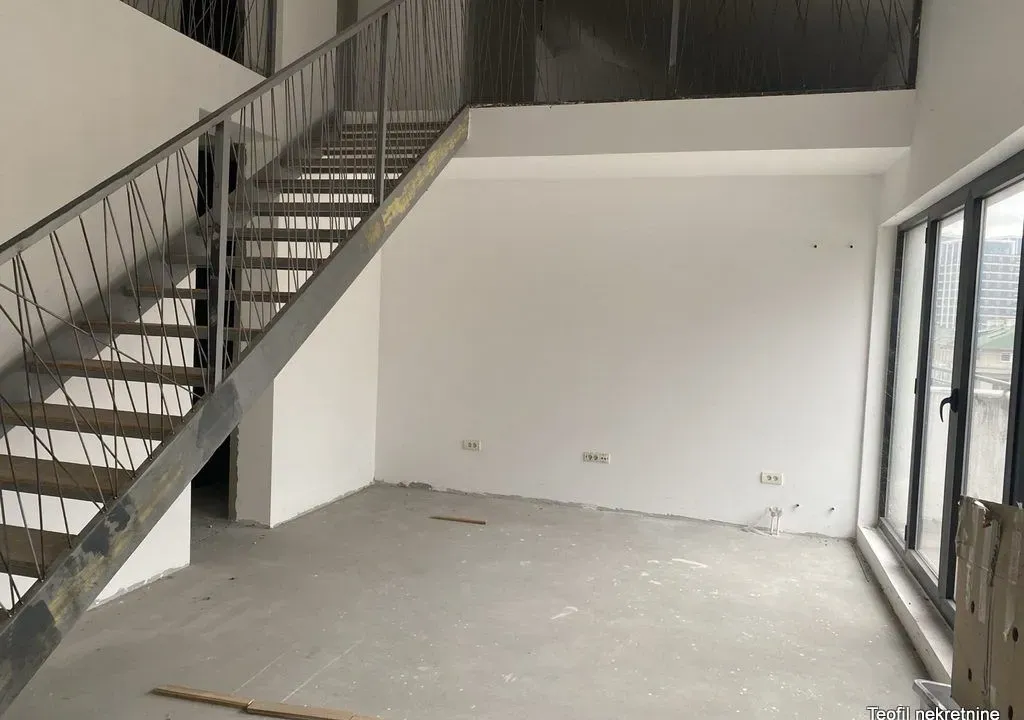 Uknjižen (na 149m2) petosoban stan u dva nivoa, mereno ima 170m2 (dve lođe i terasa). Nalazi se na petom spratu kvalitetne i dobro održavane zgrade sa interfonom, video nadzorom, (bez lifta, ali je u
